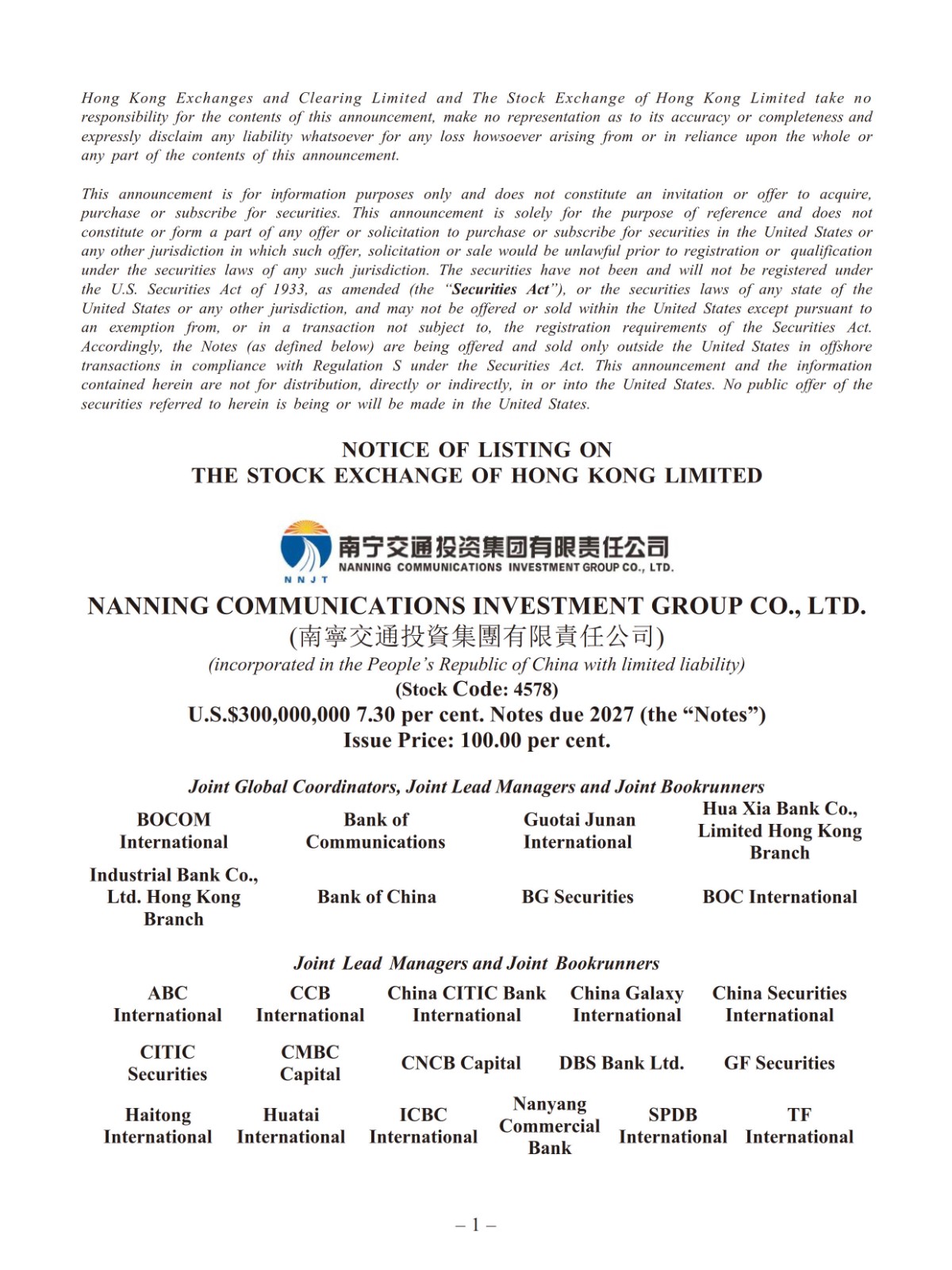 Nanning Communications Investment Group Co., Ltd.(南寧交通投資集團(tuán)有限責(zé)任公司) - U.S.$300,000,000 7.30 per cent. Notes due 2027