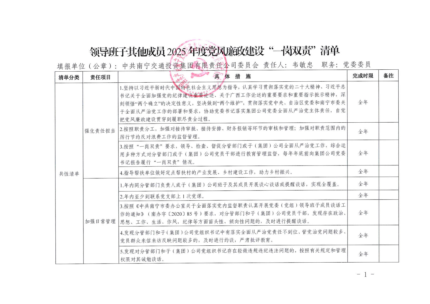 南寧交投集團(tuán)領(lǐng)導(dǎo)班子其他成員2025年度黨風(fēng)廉政建設(shè)“一崗雙責(zé)”清單(七)